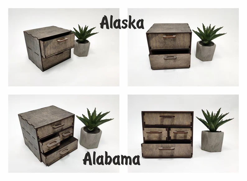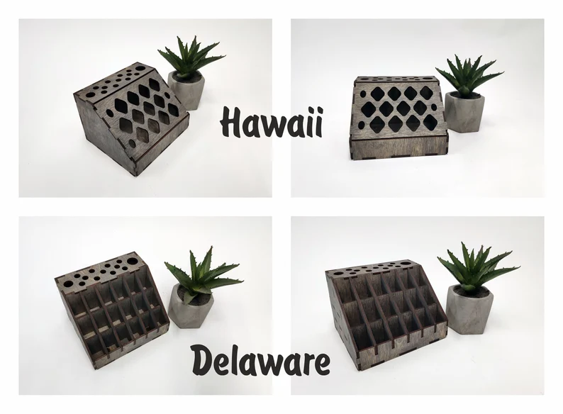 This models has the following measurements: Texas/ Alaska / Alabama : length 13,5cm/5,31in; width 13,5cm/5,31in; height 13,5cm/5,31in; New York length 31,5cm/12,4in; width 13,5cm/5,31in; height 13,5cm/5,31in ; Hawaii / Delaware length 13,5cm/5,31in; width 13,5cm/5,31in; height 11cm/4,33in; 13 holes for brushes.