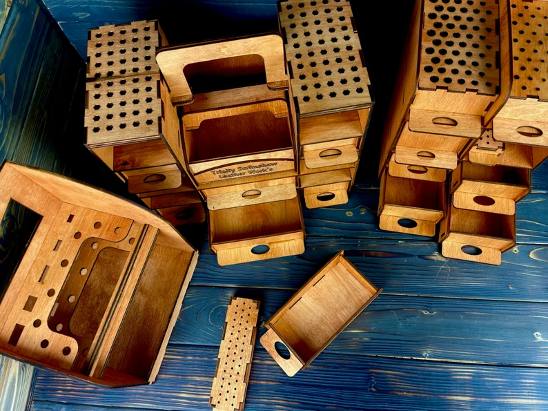 A durable wooden tool caddy capable of holding many tools.